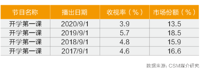 表4 2017-2020年中央电视台综合频道《开学第一课》首播收视概况(所有调查城市)