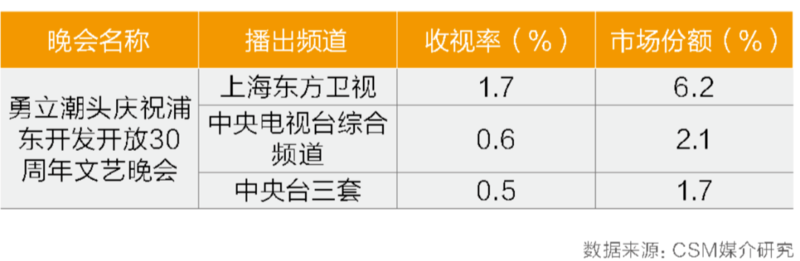 11月13日:《勇立潮头庆祝浦东开发开放30周年文艺晚会》播出时值浦东开发开放30周年之际,《勇立潮头庆祝浦东开发开放30周年文艺晚会》于2020年11月13日在中央电视台综合频道、中央台三套和上海东方卫视晚间黄金时段播出。其中上海东方卫视收视率1.7%,同时段市场份额6.2%。中央电视台综合频道和中央台三套的收视率分别为0.6%和0.5%。
