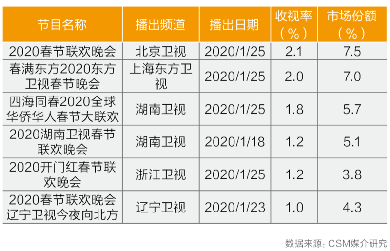 1月25日:中央台三套推出《新春喜剧之夜》《新春相声大联欢》中央台三套2020年1月25日大年初一推出喜剧晚会《新春喜剧之夜》,晚会邀请了众多影视演员、主持人、歌手等跨界出演喜剧,节目首播收视率2.3%,同时段市场份额7.0%。1月26日大年初二推出的《新春相声大联欢》也主打跨界特色,以全新的节目模式与视角,展现相声这一传统民间艺术,与观众共迎新春佳节,节目首播收视率2.0%,同时段市场份额5.9%。