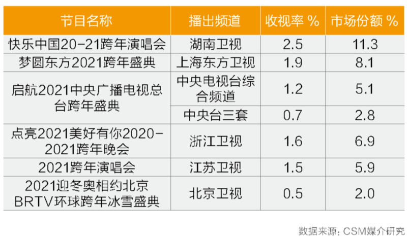 12月31日:跨年晚会播出2020年观众收看跨年晚会的热情不减,其中,湖南卫视跨年晚会收视率为2.5%,同时段市场份额11.3%;上海东方卫视跨年晚会收视率为1.9%,同时段市场份额8.1%;中央电视台综合频道和三套并机播出的《启航2021中央广播电视总台跨年盛典》两频道并机总收视率为1.9%;浙江卫视跨年晚会收视率为1.6%;江苏卫视跨年晚会收视率1.5%;由北京卫视牵头,八台九星联合播出了《环球跨年冰雪盛典》,在北京卫视的收视率为0.5%。