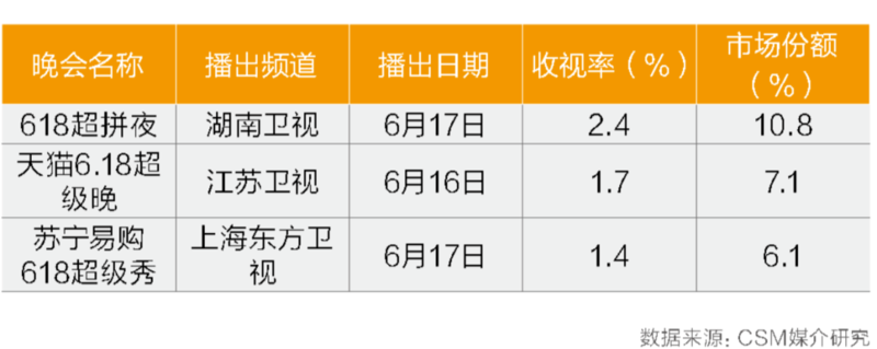 2020年的“6.18”晚会掀起了全年电商晚会的第一个高潮。其中湖南卫视的《618超拼夜》收视率2.4%,同时段市场份额10.8%。上海东方卫视的《苏宁易购618超级秀》收视1.4%,同时段市场份额6.1%。江苏卫视提前一天播出的天猫晚会收视率1.7%,同时段份额7.1%。