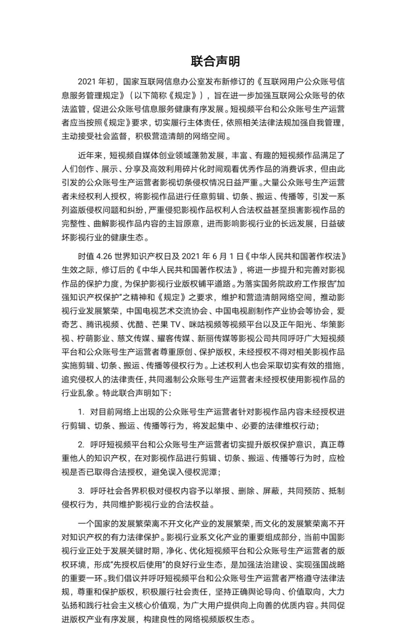 声明中表示,大量公众账号生产运营者未经权利人授权,将影视作品进行任意剪辑、切条、搬运、传播等,引发一系列盗版侵权问题和纠纷。为此: