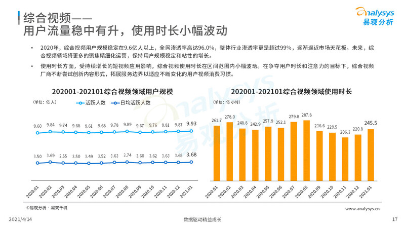 综合视频领域用户流量稳中有升,2020年全年用户规模稳定在9.6亿以上,全网渗透率高达96%,整体行业渗透率超过99%,逼近市场天花板。这要求综合视频未来进行精细化运营。