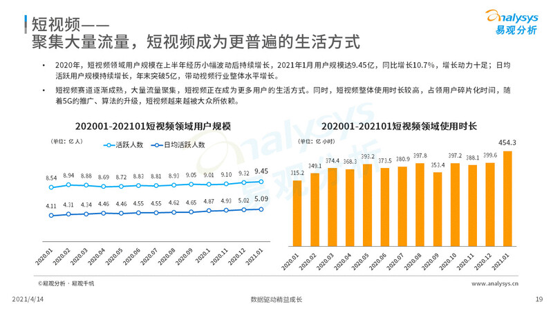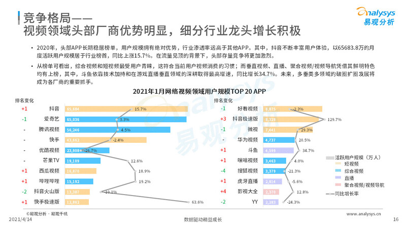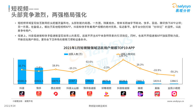 短视频头部竞争激烈,两强格局强化,抖音和快手有着用户规模上的绝对优势。抖音极速版和快手极速版加强营销力度,增速惊人。