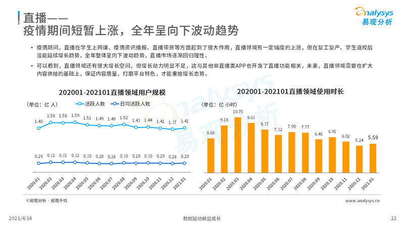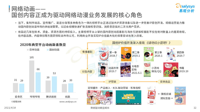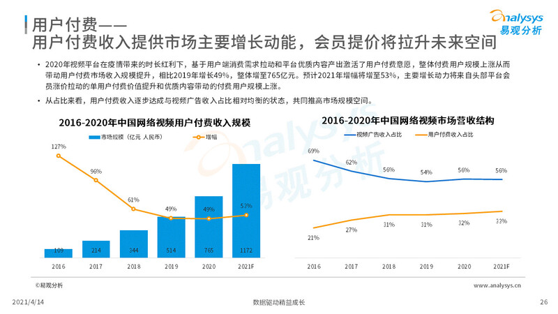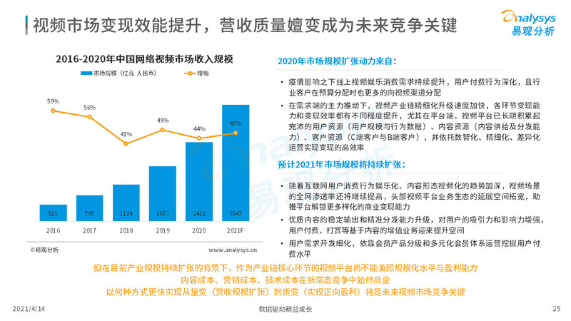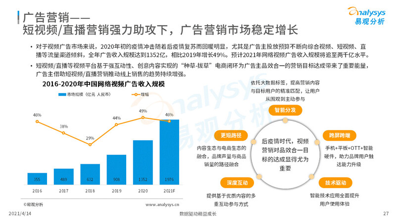 视频市场变现效能提升,营收质量嬗变成为未来竞争关键。用户付费行为深化,预计2021年市场规模将继续扩张。广告营销在疫情后出现明显回暖,预计2021年网络视频广告营销市场将达2000亿元。