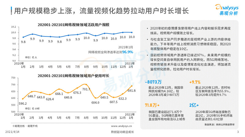 后疫情时代,流量视频化拉动用户市场增长。疫情导致用户线上内容和娱乐需求再度拔高,视频消费习惯被培养,当前视频领域用户渗透率已接近97%。