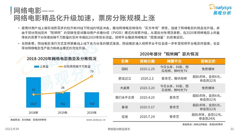 网络电影精品化加速升级,票房分账规模上涨。2020年已有79部网络电影分账票房破千万。院线转网播在疫情下成为电影产业中的新现象,带动网络电影生产能力和商业模式的优化升级。