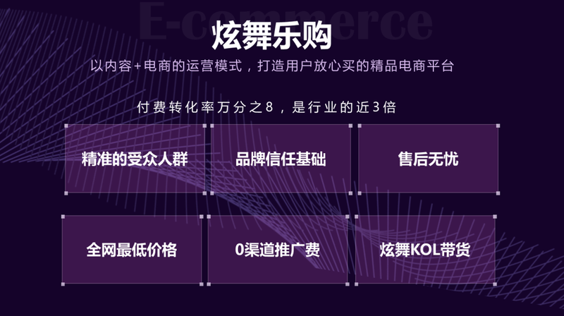 基于以上服务场景,我们针对炫舞未来的商业变现模式做出了一系列创新探索。2019年5月,我们正式推出炫舞乐购大屏电商,炫舞未来开始从正向和公益引导,向商业变现转变。相较移动端购物,我们更希望在大屏端给用户提供操作更为方便的服务,凭借精准的受众人群、品牌信任基础以及炫舞KOL的巨大影响力,目前炫舞乐购付费转化率已达到万分之八,是行业平均水平的3倍。