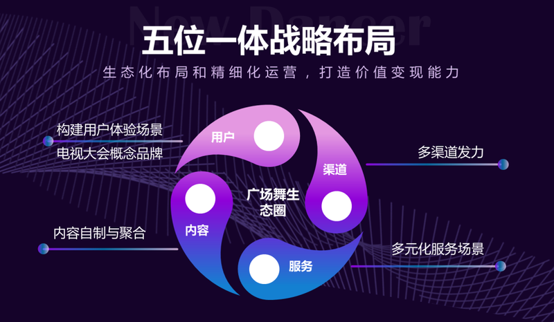 我们实行五位一体的战略布局,在老年市场大家都有一个共识,银发经济是一座新的金矿。那么,在中老年市场真正挖到矿的人有多少?对我们来说,目前已经覆盖过亿用户,覆盖18个省份的渠道市场,包括IPTV、终端硬件、有线电视等。目前在大屏端,炫舞未来广场舞全网累计用户量2000万+,付费用户量100万+,炫舞未来邀请知名明星导师入驻,每个广场舞人群都有固定人设。