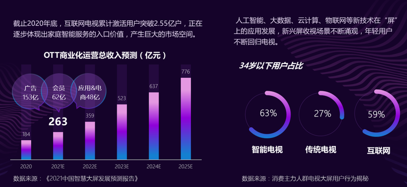 截止到2020年底,互联网电视用户数已经达到了2.55亿,预计今年OTT商业化运营总收入会在去年的基础上增长大概70%,达到263亿,广告、会员和应用、电商将是收入的三大来源。到2025年收入基本能达到700多亿,这个市场空间是巨大的,我们要在这个赛道里面挖掘更多的价值。此外,还有一组数字,智能电视34岁以下的用户占比,已经达到63%,证明OTT行业接下来是一个主流媒体阵地。