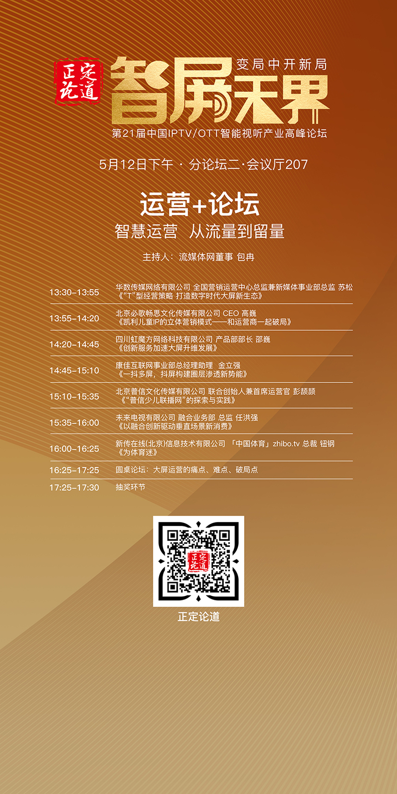 2021年5月12-13日,第21届论道暨中国IPTV/OTT智能视听产业高峰论坛在河北正定古城石家庄国际会展中心举行。12日下午,在以“智慧运营 从流量到留量”为主题的“运营+论坛”上,与会嘉宾就产业精细化运营与价值挖掘等热点话题展开了广泛探讨。