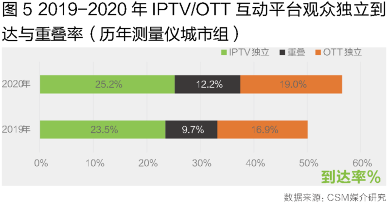 随着大屏收视设备的多元发展,观众多设备混用的情况也越来越常见。从数据上看,2020年CSM59测量仪城市组观众中,在IPTV互动平台和OTT互动平台上均有过收视的观众占所有观众的12.2%,较2019年同期提升2.6个百分点。IPTV互动频道拥有25.2%的独立到达[5],较OTT互动平台独立到达多6.2个百分点,这意味着更多的观众只在IPTV互动平台收看点播回看等非直播内容。与2019年对比,2020年IPTV互动平台独立到达提升了1.7个百分点,涨幅7.4%;OTT互动平台的独立到达提升2.1个百分点,涨幅12.7%,增幅更大,OTT互动平台在“拉新”方面势头更猛(图5)。