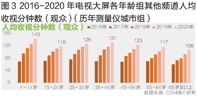 从各年龄段观众收视时长来看,2020年CSM59测量仪城市组青少年观众对其他频道的收视粘性依然是最强的。4-14岁每收视观众其他频道日均收视时长达143分钟,35-44岁观众次之,为131分钟,65岁及以上观众最低,为106分钟。各年龄段观众收视时长保持增长态势,其中除15-34岁观众外,各年龄段2020年同比增幅均超过10%(图3)。