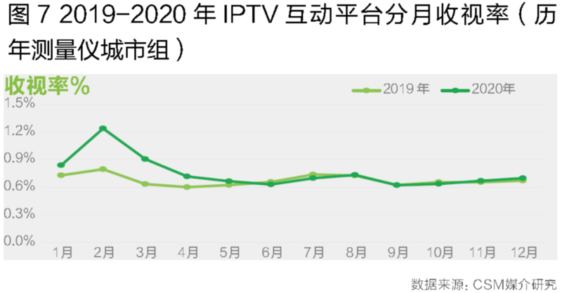 2020年,CSM59测量仪城市组IPTV互动平台收视率为0.75%,小幅提升0.08个百分点(图6)。从分月趋势上看,IPTV互动平台收视受到疫情影响明显。2020年第一季度观众居家时间变长,IPTV互动平台收视率较2019年同期显著抬高,其中2月收视率达1.24%,为全年最高值。4月开始收视缓慢回落,并于疫情平稳后逐渐恢复至上一年同期水平,年初涨势并未转变为常态化收视,仅年末回升态势优于2019年(图7)。