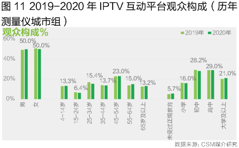 2020年,CSM59测量仪城市组IPTV互动平台观众中,45-54岁观众占比最高,达23.0%;4-14岁及45岁以上观众收视占比同比小幅增长;受教育程度方面,未受过正规教育及大学及以上受教育程度观众占比提升高,其他受教育程度观众占比小幅回落。各属性观众整体分布保持稳定,向更加均衡方向发展(图11)。