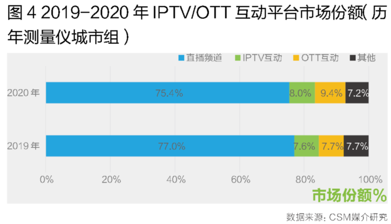 2020年,CSM59测量仪城市组IPTV互动平台和OTT互动平台的市场份额均出现小幅上涨,分别升至8.0%和9.4%,直播频道及其他收视的份额则受到挤压有所下降。其中,OTT互动平台市场份额提升更为显著,提高了1.7个百分点,涨幅达23%(图4)。