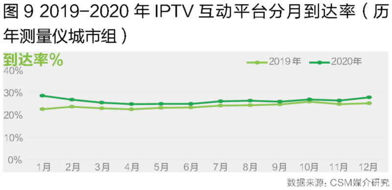 2020年,CSM59测量仪城市组IPTV互动平台观众规模有所提升,到达率由2019年同期的33.2%上涨至37.5%,提升了4.3个百分点,涨幅为12.8%(图8)。分月来看,2020年1月正值农历新年和疫情初期,节假日与居家隔离为IPTV互动平台提供了更大的观众基础,IPTV互动平台观众规模增长显著,到达率为28.5%,较上一年同期拔高6个百分点。到了5月疫情平稳后月到达走势恢复常态,仅在9月开学时期出现异于同期的小幅回落,于年末迎来二次高峰,各月到达率水平均高于2019年同期(图9)。