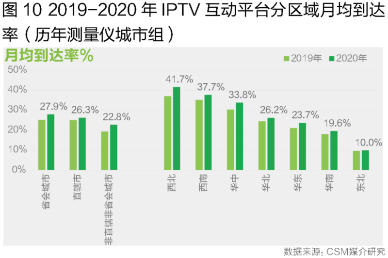 2020年,CSM59测量仪城市组IPTV互动平台月平均观众规模在各区域均呈现提升,升幅有所差异。从行政区划看,省会城市IPTV互动平台月平均到达率最高,为27.9%;非直辖市非省会城市増势更胜,月平均到达率较2019年同期提升3.4个百分点,涨幅达17.4%,高于省会城市和直辖市。从地域区划看,西北地区IPTV互动平台月平均到达率高达41.7%,居各区域之首,较2019年同期增涨4.6个百分点,增长值同样领先其他各地区;西南、华中地区IPTV互动平台观众规模持续保持良好势头,东北地区IPTV互动平台到达率表现相对较弱(图10)。