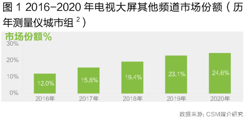 2020年CSM59测量仪城市组电视大屏收视中, 24.6%的市场份额来自以非直播收视为主的其他频道,较2016年的12.0%提升一倍之多。从近5年数据来看,其他频道收视份额连年增长,其增速有所放缓,年增长从3.8个百分点降至1.5个百分点(图1)。