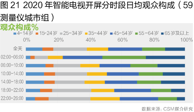 2020年CSM59测量仪城市组智能电视开屏观众中,45-54岁和25-34岁观众占比最高,分别占21.3%和21.1%;15-24岁观众在各年龄段中占比最低,仅为6.9%。4-14岁观众在上午6:00-10:00占比最高,为12.4%;10:00-18:00日间时段占比均在10%以上,晚间相对较低。25-54岁人群呈现时间越晚占比越高的趋势,55岁以上的中老年观众则趋势相反(图21)。