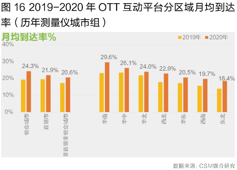 ▍OTT互动平台观众规模提升,华南地区“月活”及涨势最佳