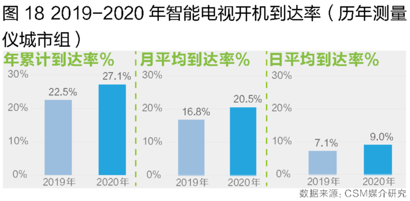 智能电视是家庭客厅媒体,是更适合多人收视的场景。区别于设备覆盖量和终端开机数据的“户”到达,智能电视开机到达率指的是“人”到达,与常规电视大屏收视数据口径一致,更能准确评估智能电视开屏广告的触达“人数”。2020年,CSM59测量仪城市组智能电视开屏整体累计到达率为27.1%,同比上涨4.6个百分点;月均到达率超过两成,达20.5%;日均到达率小幅升高1.9个百分点,达9.0%(图18)。