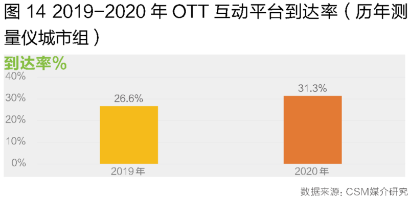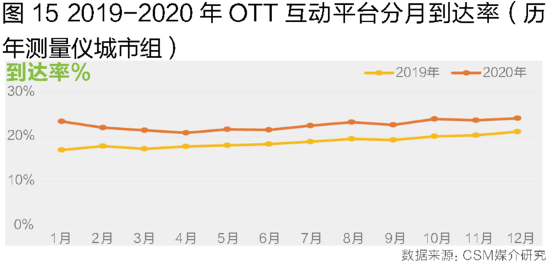 2020年,CSM59测量仪城市组OTT互动平台观众规模提升,到达率由2019年同期的26.6%上涨至31.3%,提升4.7个百分点,涨幅为17.5%(图14)。分月来看,2020年OTT互动平台分月到达率走势与上一年整体相似,数值普遍偏高。1月,受春节和疫情影响,OTT互动平台到达率走高,同比增长了6.4个百分点(图15)。