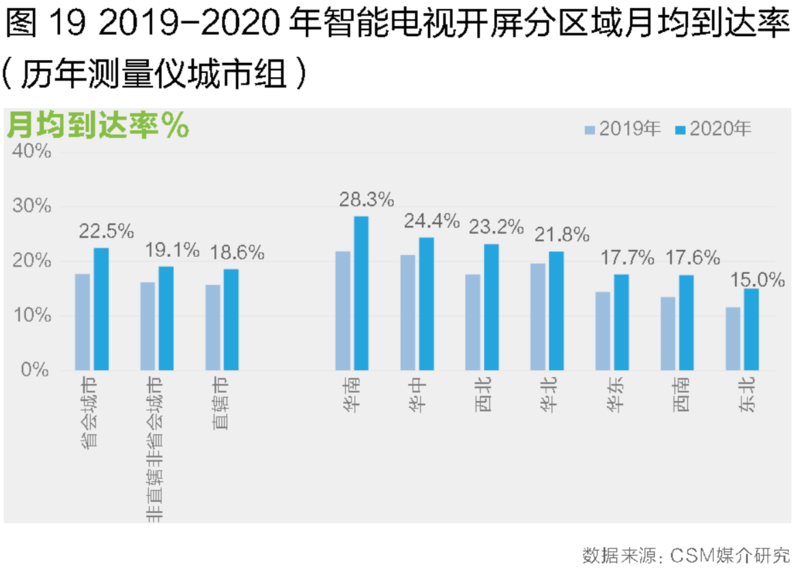 从行政区划看,2020年CSM59测量仪城市组中,省会城市智能电视开屏月平均到达率最高,为22.5%,较2019年同期提升最多,上涨4.8个百分点。从地域区划看,华南地区智能电视开屏月平均到达率最高,达28.3%,同比上涨6.4个百分点,增长值最大(图19)。