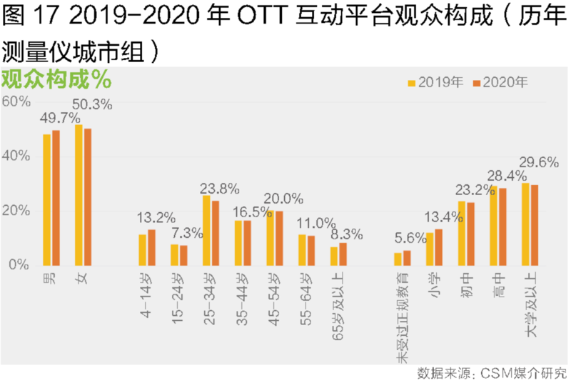 2020年,CSM59测量仪城市组OTT互动平台观众中,中青年、高学历观众仍为收视主力。25-34岁观众在各年龄段观众中收视占比最高,达23.8%,但较2019年同期下降2个百分点,4-14岁和65岁及以上观众收视占比同比分别上涨1.8和1.4个百分点;高中和大学及以上受教育程度观众占比最高,均接近三成,但较上一年有小幅回落,小学及以下受教育程度观众占比较上一年有所提升(图17)。