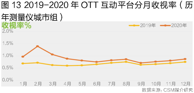 2020年,CSM59测量仪城市组OTT互动平台收视率为0.89%,较2019年同期提升0.21个百分点,涨幅达31.7%(图12)。从分月趋势上看,受疫情影响,OTT互动平台收视1-5月均同比大幅上扬。其中2月收视率达1.4%,为全年最高值。其后收视逐步回落,6月开始各月收视变化趋势与上一年同期一致,收视水平较同期稳定偏高0.1个百分点,年初积蓄的上涨态势得以存续(图13)。