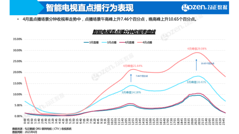 4月直点播场景分钟收视率走势中,点播场景午高峰上升7.46个百分点,晚高峰上升10.65个百分点。