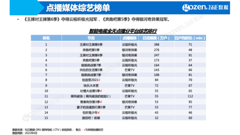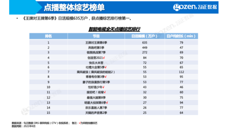 《王牌对王牌第6季》日活规模达635万户,获点播综艺排行榜第一。