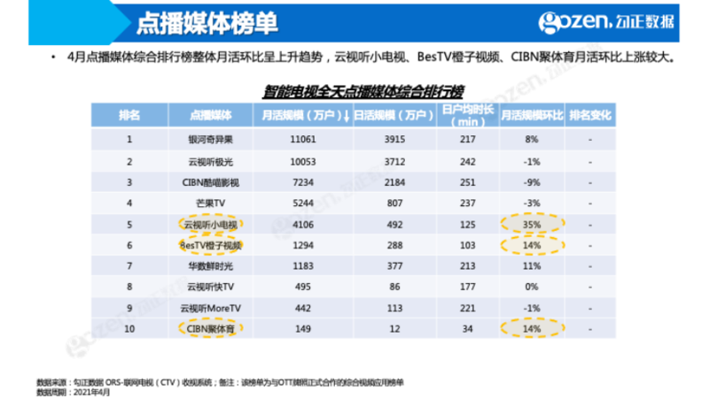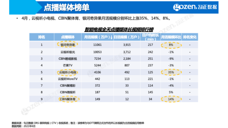 4月,云视听小电视、CIBN聚体育、银河奇异果本月分别环比上涨35%、14%、8%。