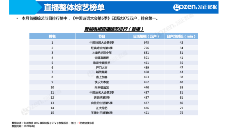 •直播综艺:本月首播综艺节目排行榜中,《中国诗词大会第六季》日活达975万户,排名第一。