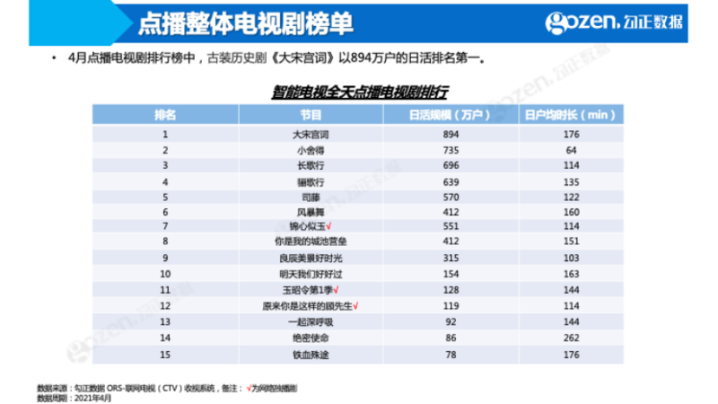 •点播剧:4月点播电视剧排行榜中,古装爱情剧《大宋公词》以894万户的日活排名第一。