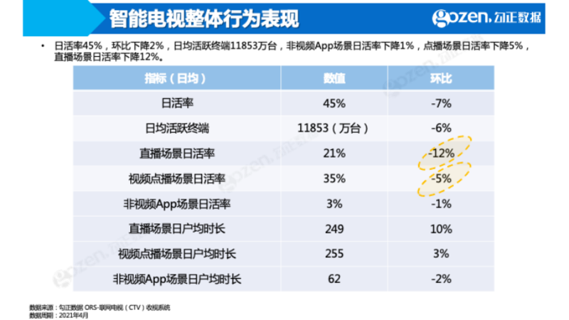 日活率45%,环比下降2%,日均活跃终端11853万台,非视频APP场景日活率下降1%,点播场景日活率下降5%,直播场景日活率下降12%。