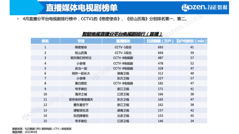 4月直播分平台电视剧排行榜中,CCTV1的《绝密使命》、《经山历海》分别排名第一、第二。