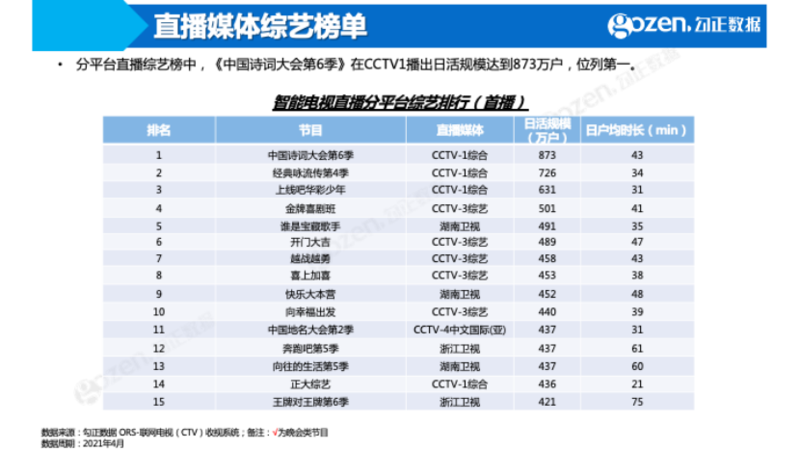 分平台直播综艺榜中,《中国诗词大会第6季》在在CCTV1播出日活规模达到873万户,位列第一。