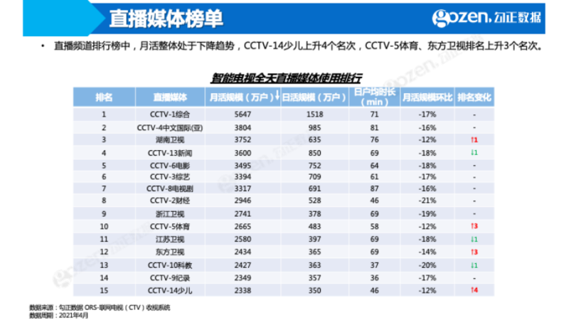 直播频道排行榜中,月活整体处于下降趋势,CCTV-14少儿上升4个名词、CCTV-5体育、东方卫视排名分别上升3个名次。