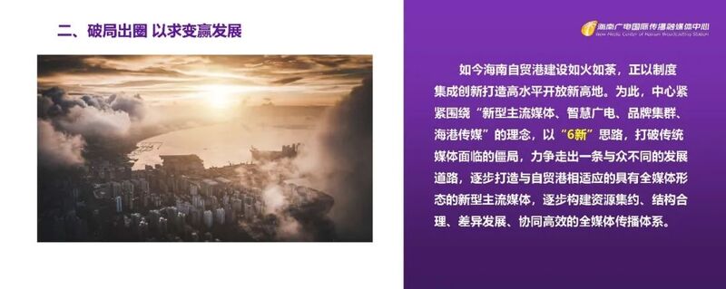 如今海南自贸港建设如火如荼,正以制度集成创新打造高水平开放新高地。为此,我们紧紧围绕“新型主流媒体、智慧广电、品牌集群、海港传媒”的理念,以“6新”思路,打破传统媒体面临的僵局,力争走出一条与众不同的发展道路。