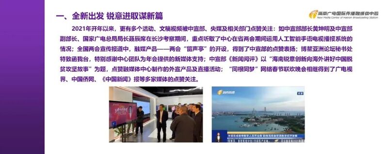 两会期间海南广电也与长沙的人工智能手语电视播报系统进行了合作并得到总局和中宣部领导的高度认可。与此同时在这里也要感谢我们科技司的领导,在今年广电总局举办的2021年首届高新视频创新应用大赛中,中心的“5G+8K VR 海底直播系统项目”荣获虚拟现实视频类三等奖。
