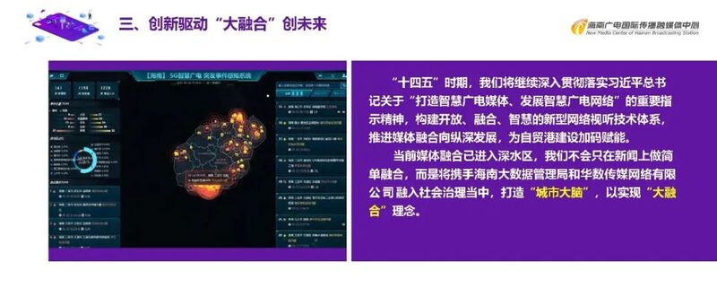 当前媒体融合已进入深水区,我们不会只在新闻上做简单融合,而是将携手海南大数据管理局和华数传媒网络有限公司融入社会治理当中,打造“城市大脑”,以实现“大融合”理念。