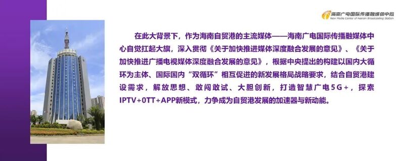 我们自贸港不是海南的自贸港,是中国的自贸港,更是世界的自贸港,5G新视听,我们正在探索如何能够给自贸港进行赋能,所以我今天给大家介绍一下海南广电做的一些尝试。