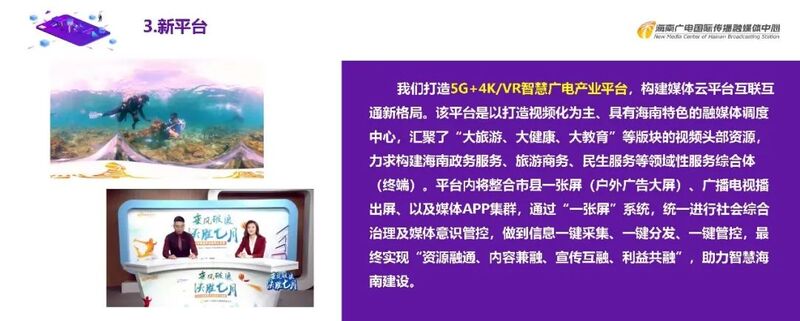 我们打造的“5G+4K/VR智慧广电产业平台”,是以打造视频化为主、具有海南特色的融媒体调度中心,汇聚了“大旅游、大健康、大教育”等版块的视频头部资源,力求构建海南政务服务、旅游商务、民生服务等领域性服务综合体。