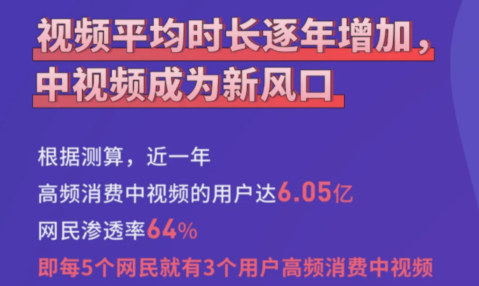 根据西瓜视频与新榜联合发布的《中视频创作人职业发展报告》,近一年高频消费中视频的用户达6.05亿,网民渗透率64%,即每5个网民中就有3个用户高频消费中视频。中视频消费的风口已经来到。