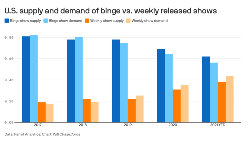 2017年-2021年6月一次放出及周播模式美剧供给数据对比。图片来源:Axios