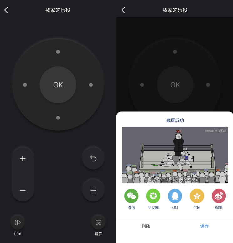 视频投屏成功后,乐播投屏APP会自动跳转至遥控器界面,用户可以通过手机进行暂停、快进/快退、音量调节、倍速播放、截图等操作。
