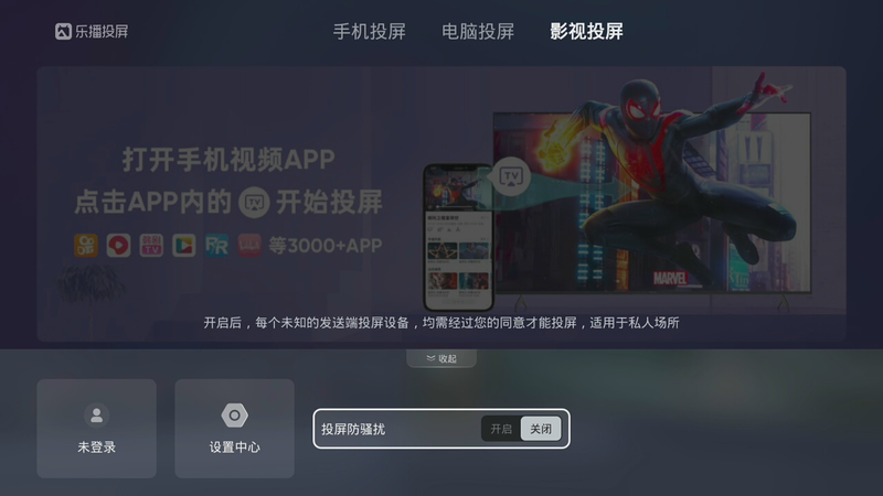 乐播乐投的界面非常简洁,有手机投屏、电脑投屏、影视投屏等不同投屏场景的提示和引导。