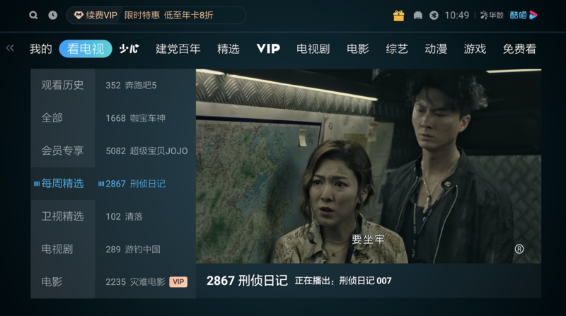除了帧享影音提升带来的影院级视听效果,酷喵还从环境设计上更贴合大屏独特体验。一方面,当你在电影频道选择作品时,背景会自动全屏播放预告片、片花,配合文字介绍,直观展示内容;另一方面,选择单个作品后,你会直接进入全屏播页面观看全屏内容,快速沉浸影片情景,而不再需要手动“全屏”。