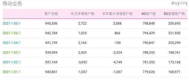 7月20日消息,中国移动公布了2021年6月运营数据。今年6月,中国移动用户净增272.2万户,总数量高达9.45506亿户,5G用户净增2874.5万户,累计用户已达2.50695亿户。